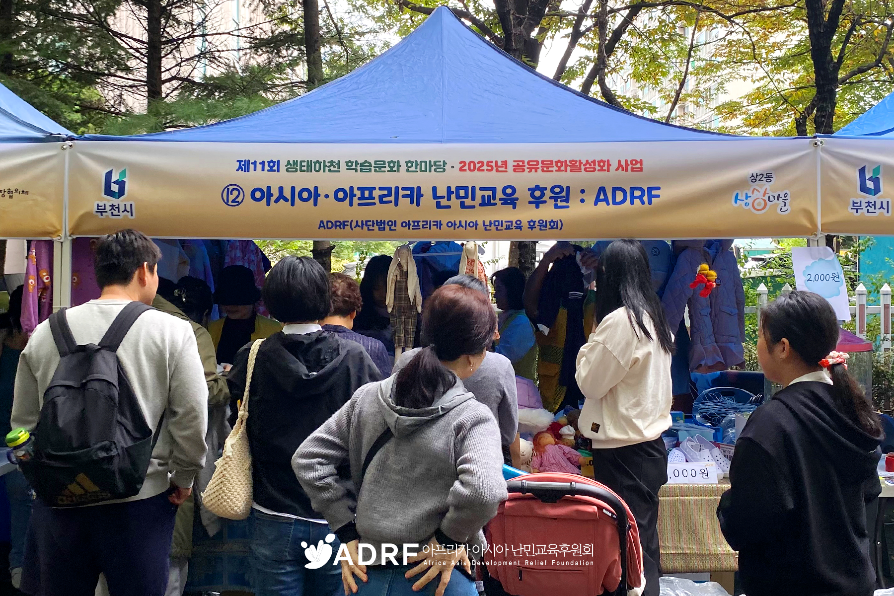 ADRF가 부천시 상2동 주민자치회에서 주최하는 생태하천학습문화한마당에 참가했습니다. ADRF는 이번 행사에서 후원받은 아동복과 인형, 학용품 등을 판매하고 단체를 홍보하는 시간을 가졌습니다. 아울러 행사가 끝난 후에는 상2동 주민자치회에서 행사 수익금을 ADRF에 전달했답니다. ADRF는 매년 생태하천학습문화한마당에 참가해 플리마켓 부스를 열고 있는데요. 직접 ADRF를 만나고 싶은 분은 내년에 만나요~!